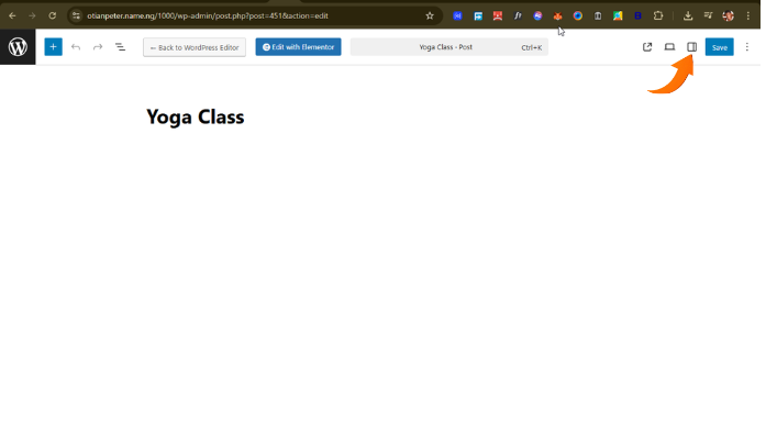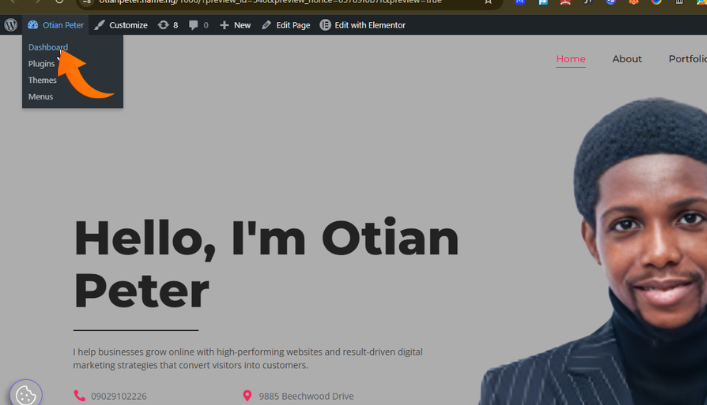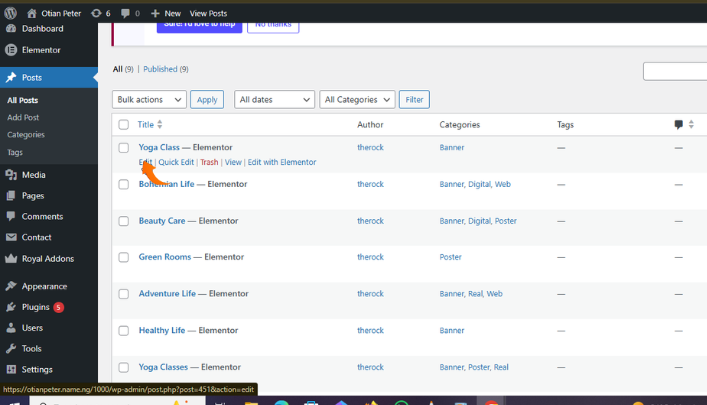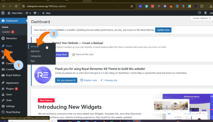 Step 1: Go to the post section on your wordpress dashboard. How to ge there from elementor page? Make sure you open your site on another tab e.g otianpeter.name.ng then select the dashboard Icon on the top left then select dashboard on the drop down.