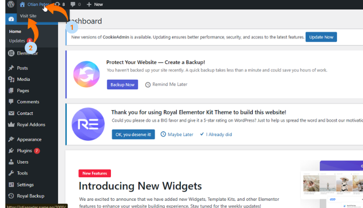 Once you’re logged in, hover over your site title at the top left. You’ll see the “Visit Site” option appear—click it to go to the front page.