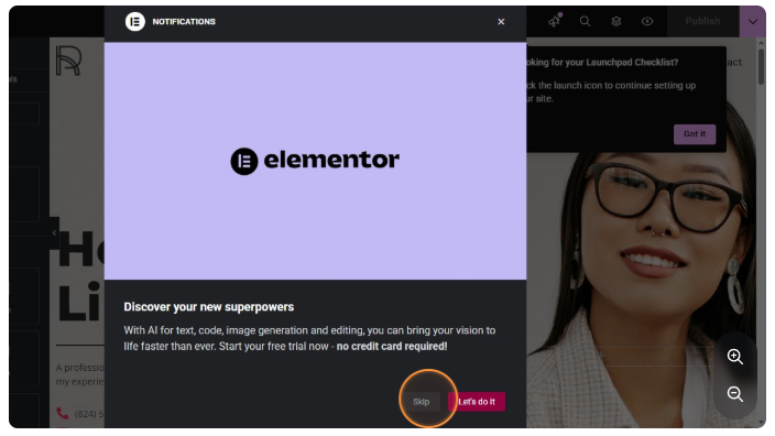 STEP 3: At this point the Elementor page builder is open. Click “skip” to escape the popup from the screen (Note: this popup comes only when you are opening Elementor on that page for the first time).