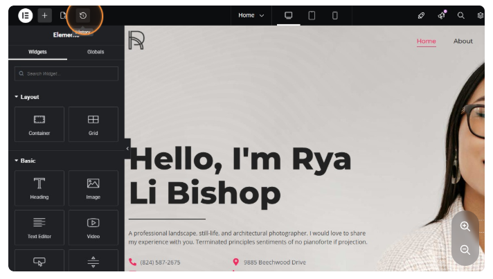 The history button is important. When you make a mistake, you can always go there to track and undo all your previous mistakes. So Elementor is forgiven. when you make mistakes.