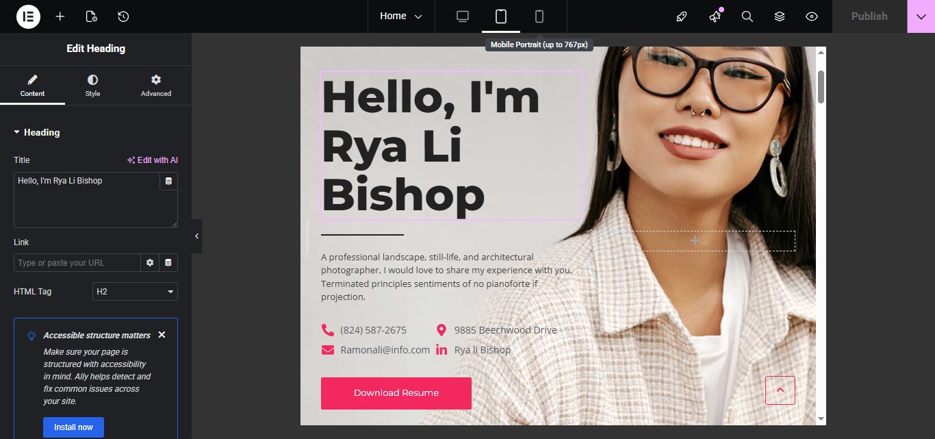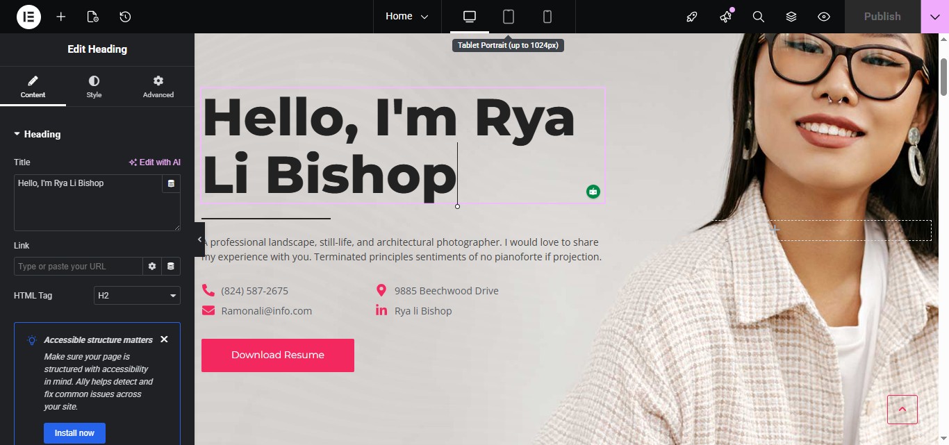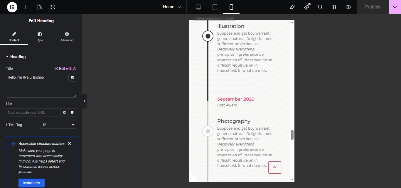 The Heading widget is used to add titles (H1–H6) to your page.